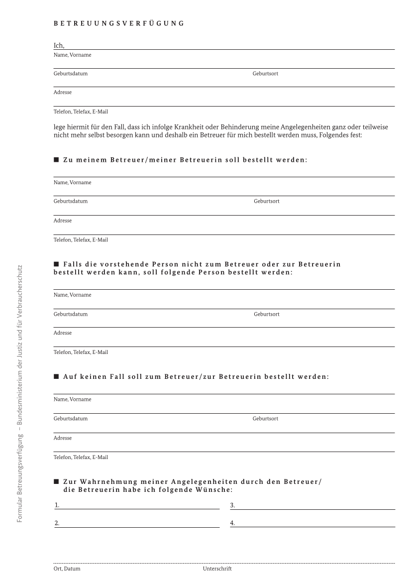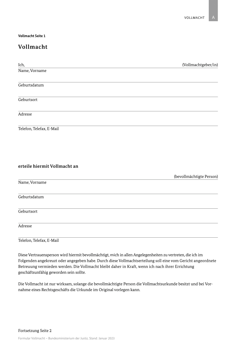 Das Bundesministerium der Justiz hält mehrsprachige Formulare zu Vorsorgevollmacht und Betreuungsverfügung bereit.