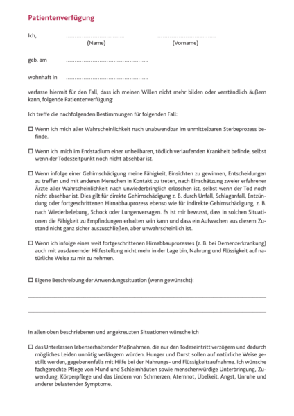 Wir haben Ihnen nützliche Links zur Patientenverfügung zusammengestellt. Die Verbraucherzentrale bietet ein Online-Formular, das Sie direkt im Web-Browser ausfüllen können. Zudem haben wir Ihnen eine PDF verlinkt, die Sie direkt herunterladen und ausfüllen können. Melden Sie sich bei uns, wenn Sie weitere Beratung benötigen.